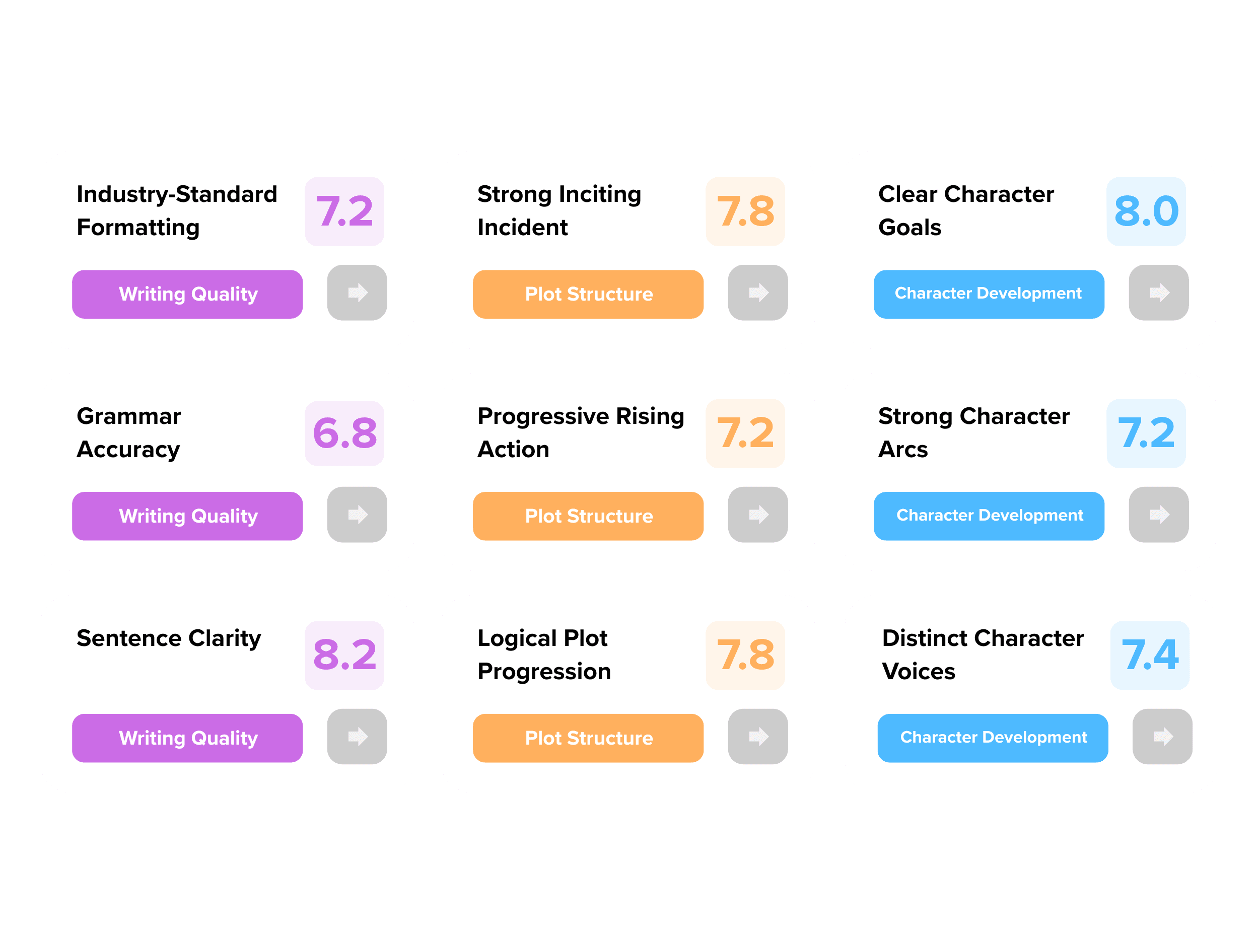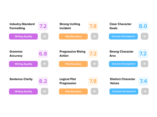 Our AI evaluates 45+ metrics, providing insights on plot, pacing, dialogue, and more.