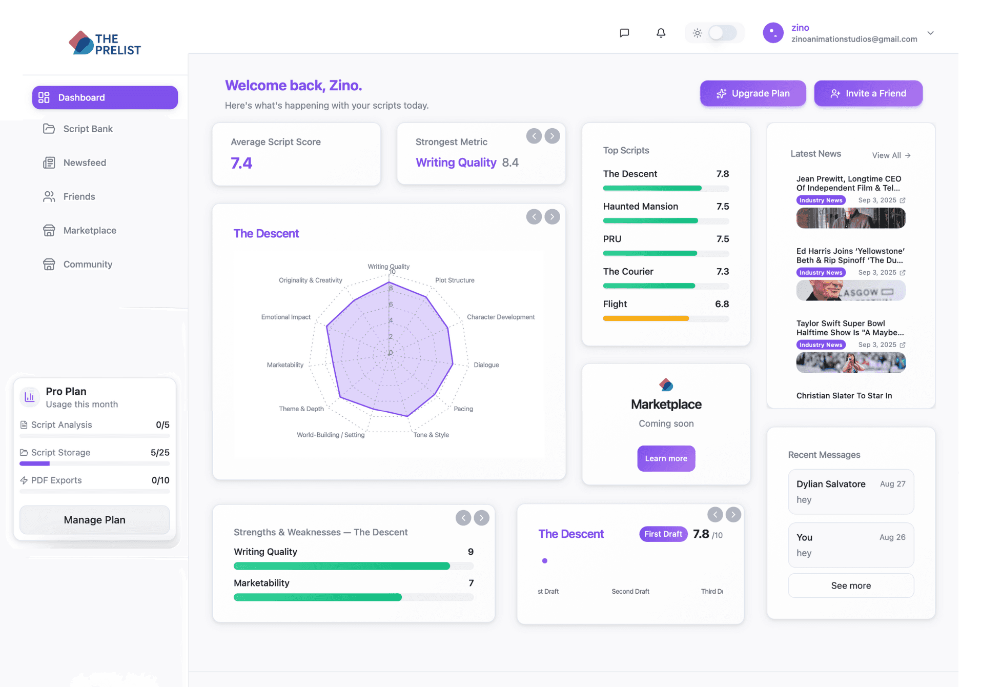 Upload your script. Instantly receive analysis on 45+ metrics, including plot, pacing, dialogue, character development and more.